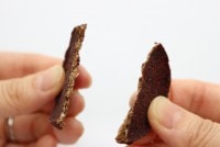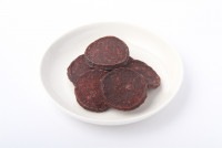 エゾシカ肉は高タンパク、低カロリー、低アレルギー(全てにでない訳ではありません。)として注目されている素材です。エゾシカ肉を一度ミンチ肉にしてから棒状にしたものをスライスしています。一度ミンチにしていますので、手で簡単に割ることができてワンちゃんに与えやすいです。